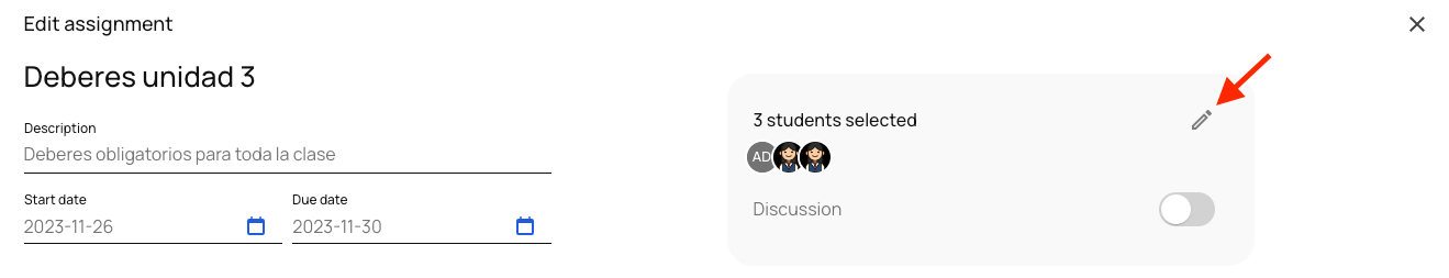 8) You can check the list of students who will receive the assignment in "students selected". By default, the assignment will be assigned to all the members of the group. Click on the pencil icon to check the list of members.