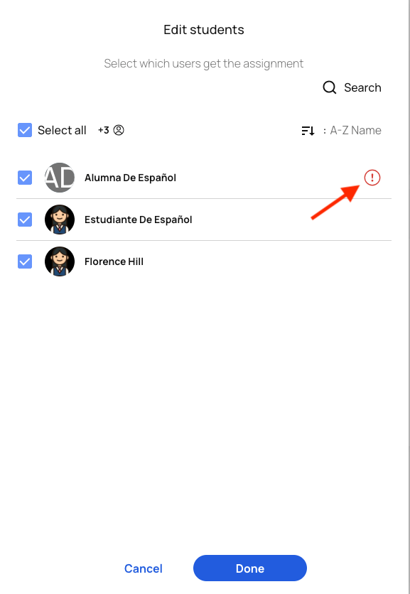 In the "Edit students" window, you will be able to select or unselect members of the group so that they can receive the assignment or not. The red icon with the exclamation mark next to a name indicates that the student does not have an active access to the content you are assigning. The student will receive the assignment, but will not be able to open or complete it until they activate their access to the content.