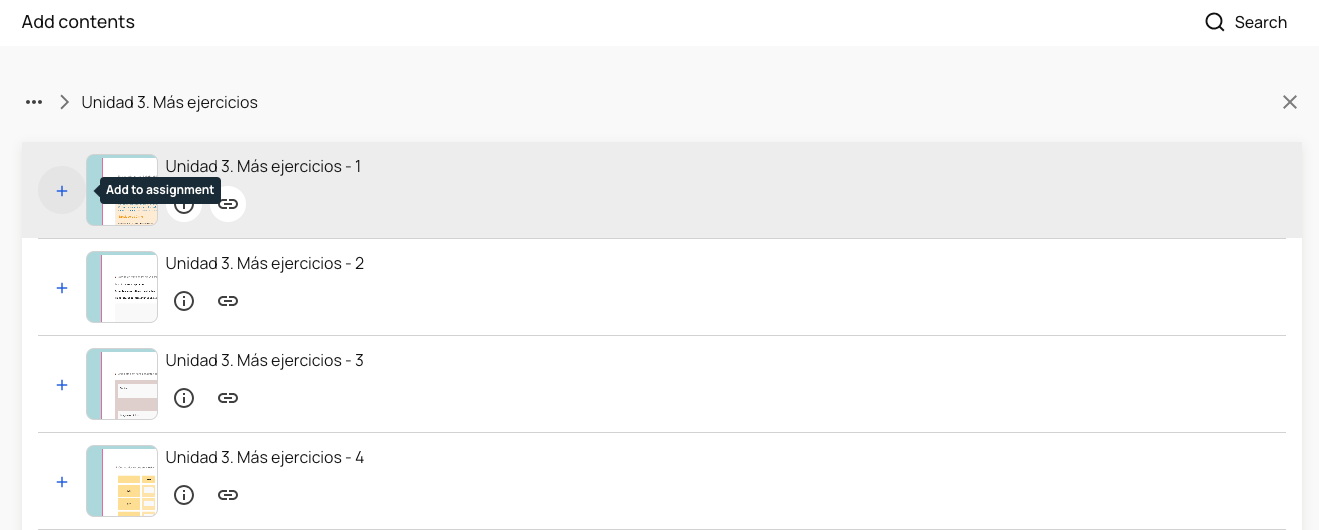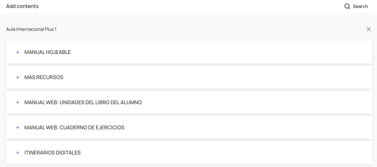 7) To select the content, click on the textbook you want to assign activities from. Click on the blue "+" sign to add content. To unfold a section, you must click on its name or on the horizontal bar. If you click on "+", you will be adding all of its contents.