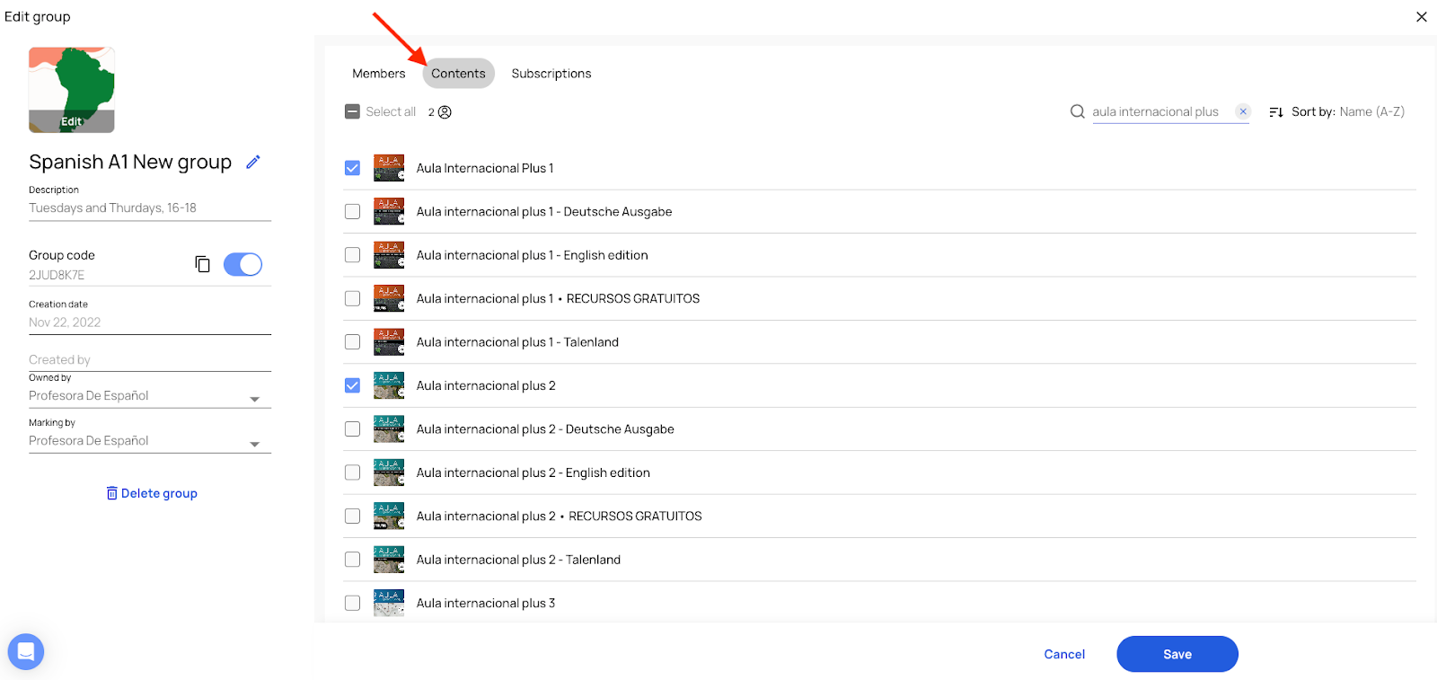 If you haven't associated textbooks to the group yet, you won't see any books in the "Add contents" section. To associate textbooks to the group, go back to the group screen and click on "Edit" on the top right corner. Then, open the "Contents" tab and select the book or books you wish to use in that group.