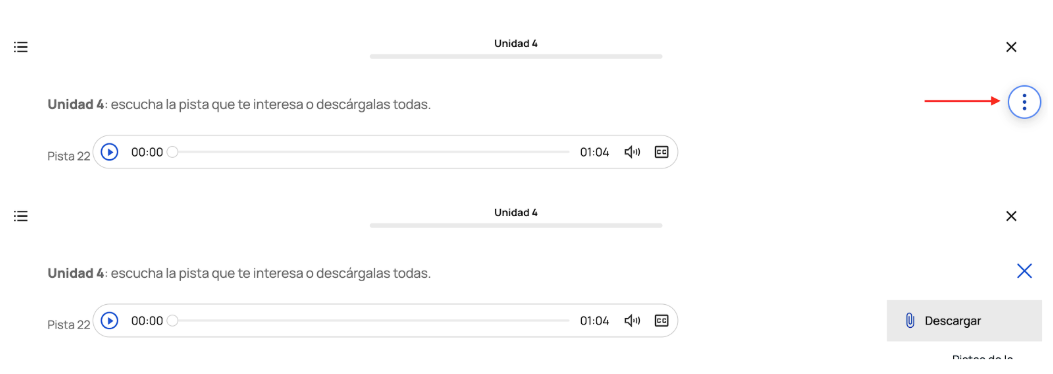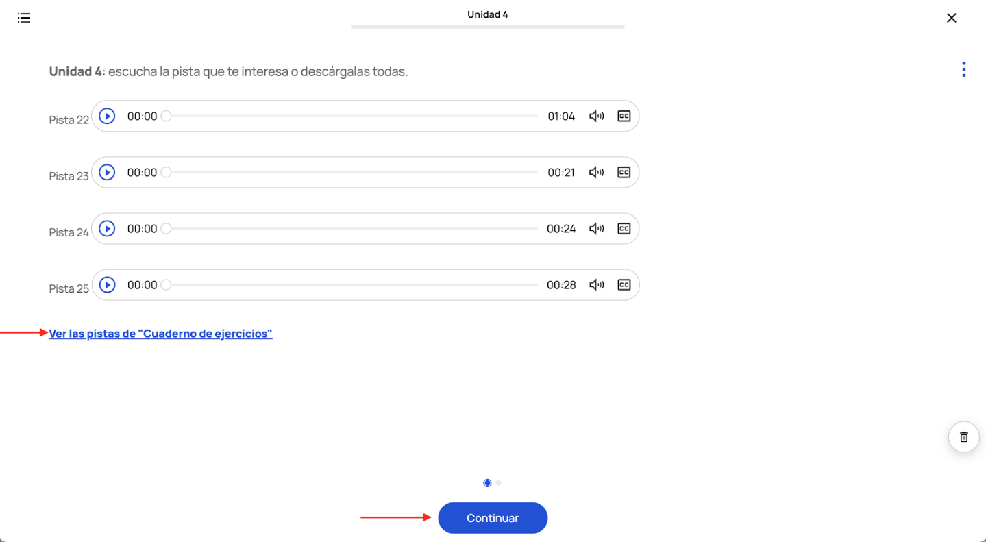 To access the workbook audios, you must open the "Pistas de audio" window in the corresponding unit and click on "Continue" to move from the student book audio files to those of the workbook.