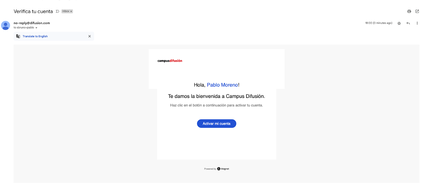 Tras completar el formulario de registro recibirás a tu cuenta de correo un e-mail similar a la captura de pantalla aquí abajo de no-reply@difusion.com via amazonses.com para confirmar tu cuenta.