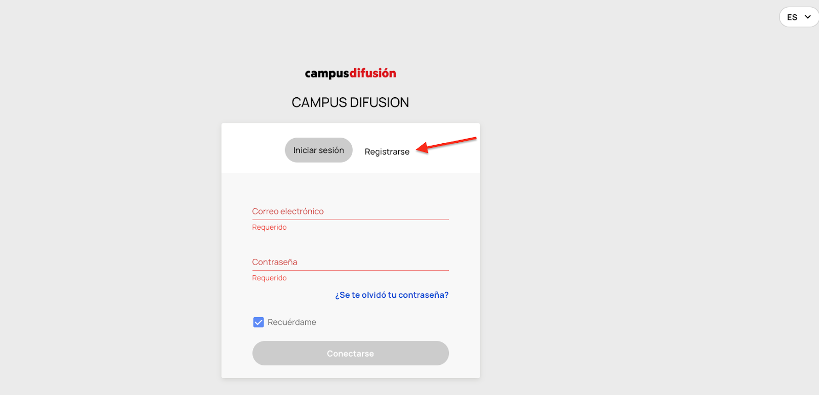 Clica en “Registrarse” situado a la derecha de "Iniciar sesión" y completa los campos solicitados para crear correctamente tu perfil.