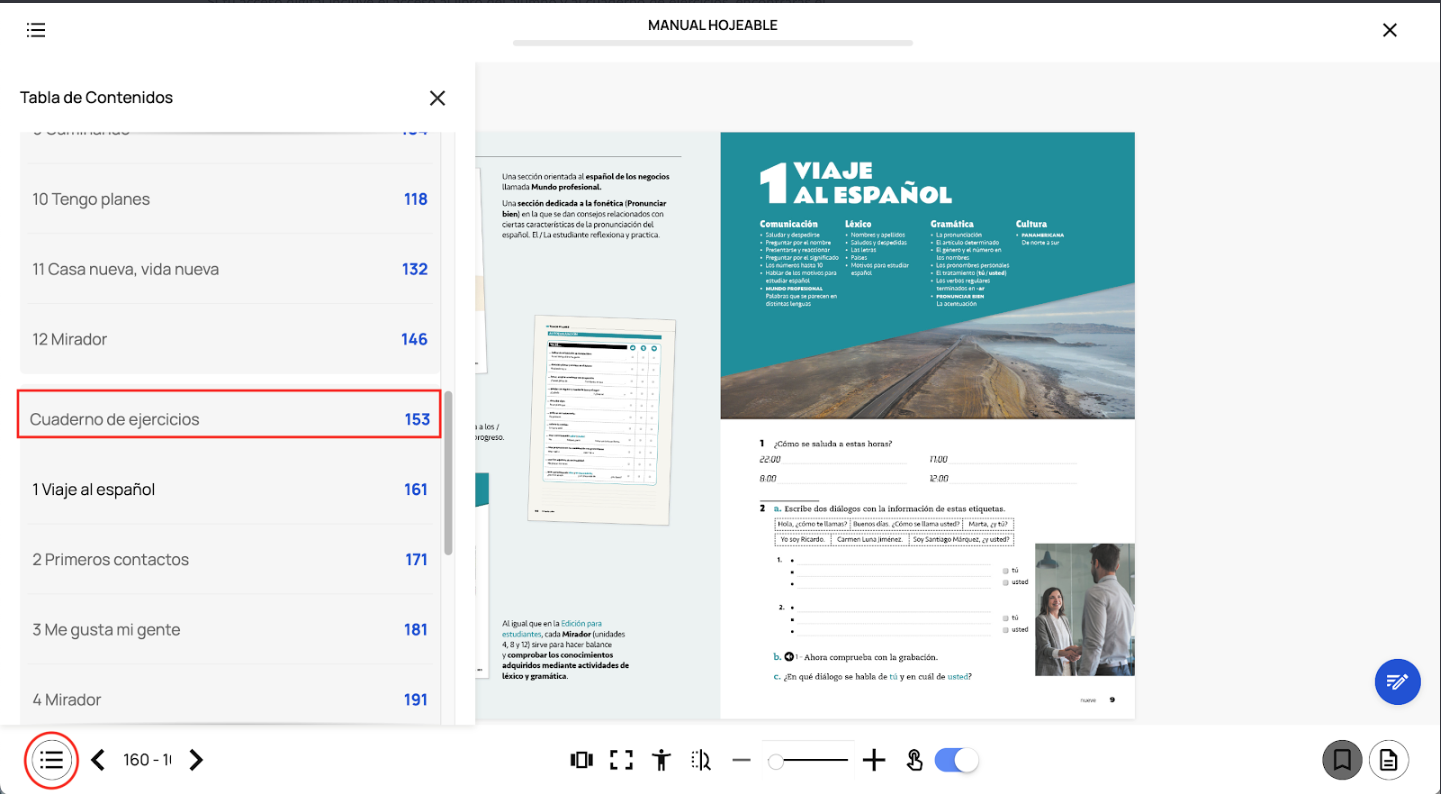 Si tu acceso digital incluye el acceso al libro del alumno y al cuaderno de ejercicios, encontrarás el cuaderno de ejercicios digital detrás del libro del alumno. Puedes hacer clic en el icono en el extremo izquierdo de la barra de herramientas para desplegar la tabla de contenidos e ir directamente al cuaderno de ejercicios.
