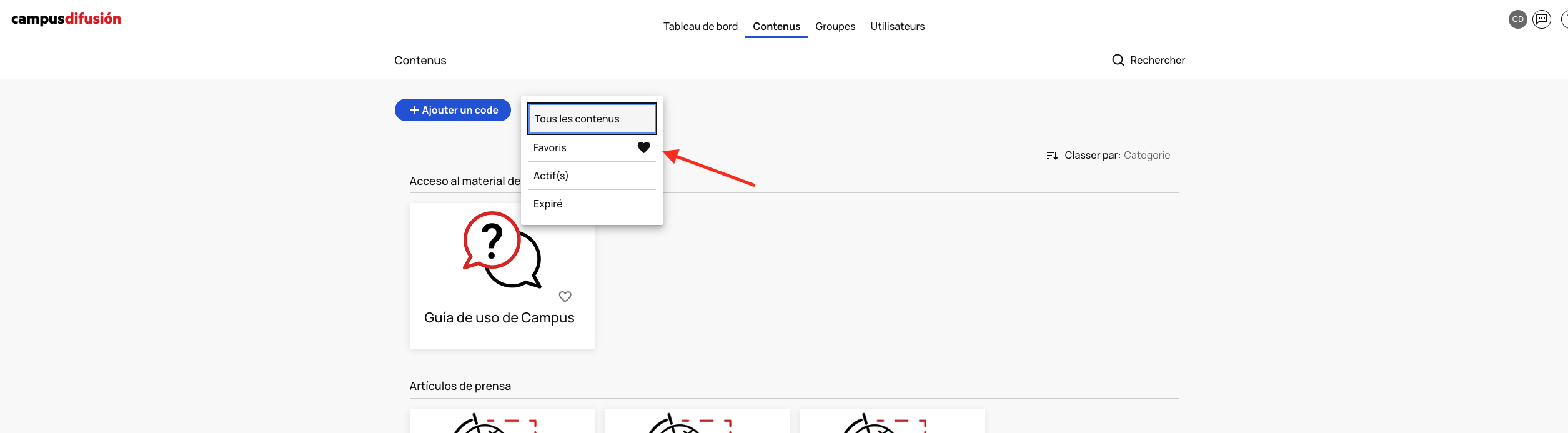 Vous pourrez alors accéder directement à la liste des favoris en cliquant en haut de la page sur « Tous les contenus » puis sur « Favoris ».