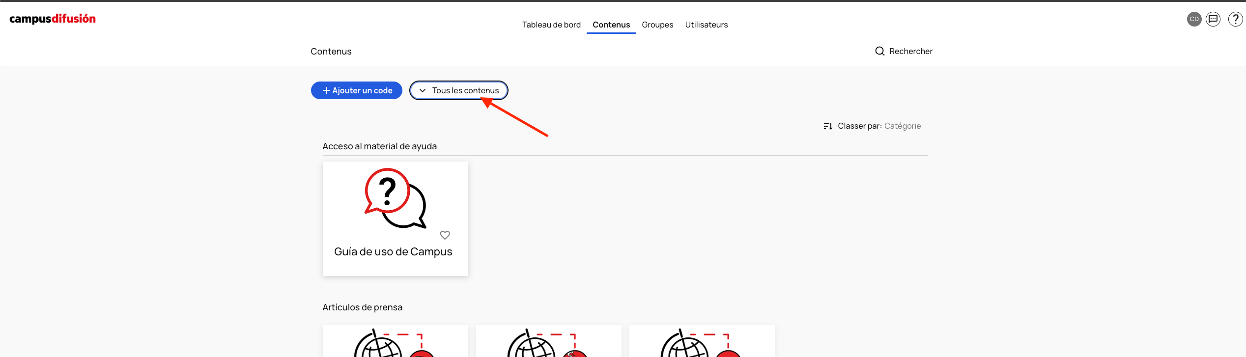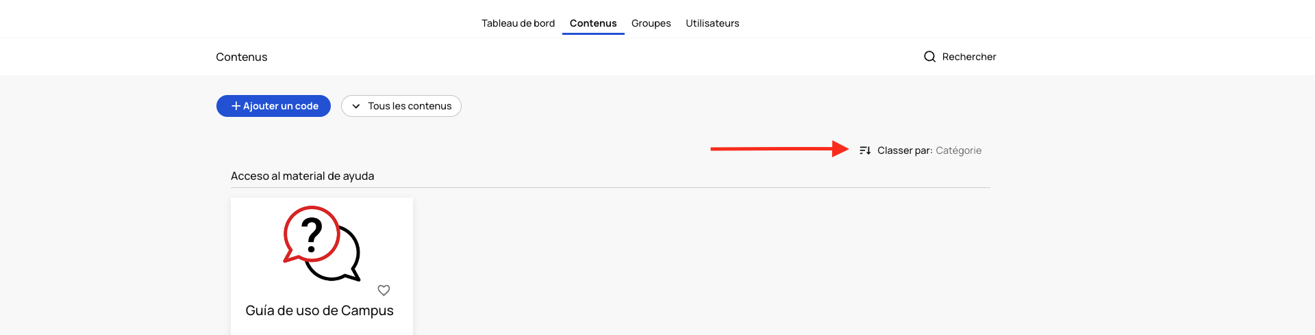 Pour modifier l'ordre dans lequel sont affichés les manuels, sur l'onglet « Contenus », cliquez à droite sur « Classer par ». Vous pouvez organiser votre écran par noms de manuels, par catégories, etc.