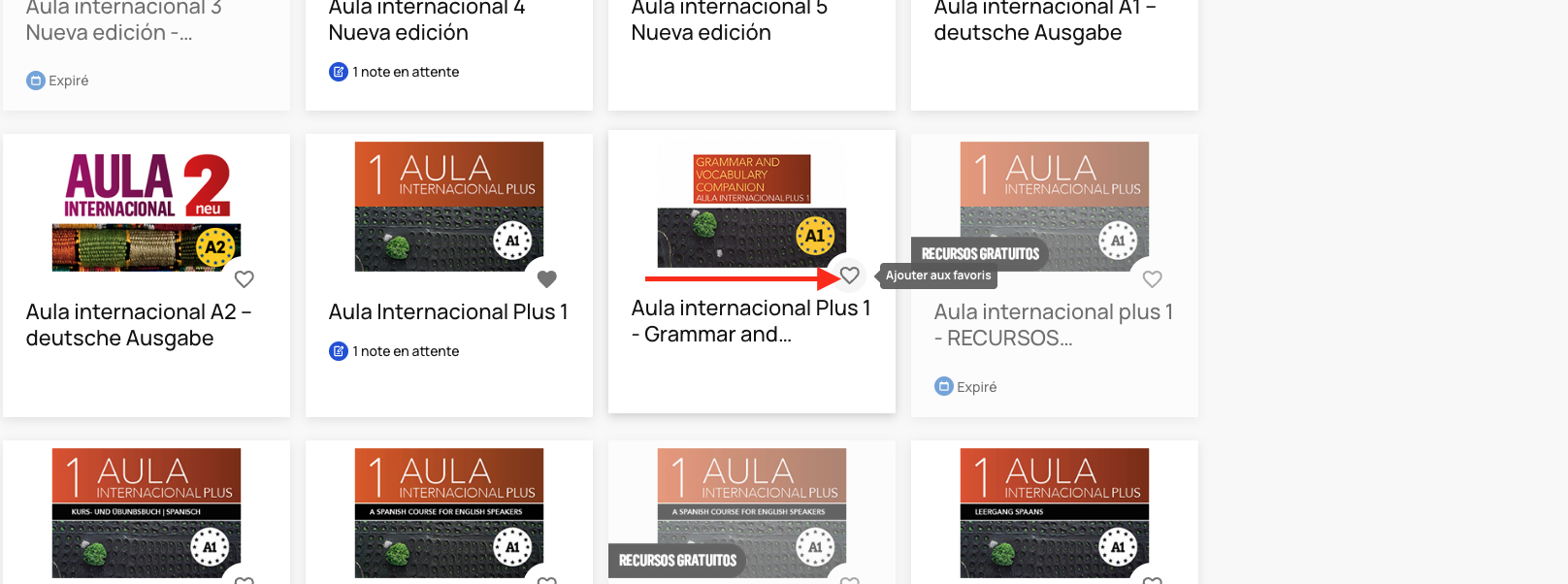 Depuis l’onglet « Contenus », vous pouvez également ajouter à votre liste de favoris les manuels que vous utilisez le plus fréquemment en cliquant sur l'icône en forme de cœur à côté de leur nom.